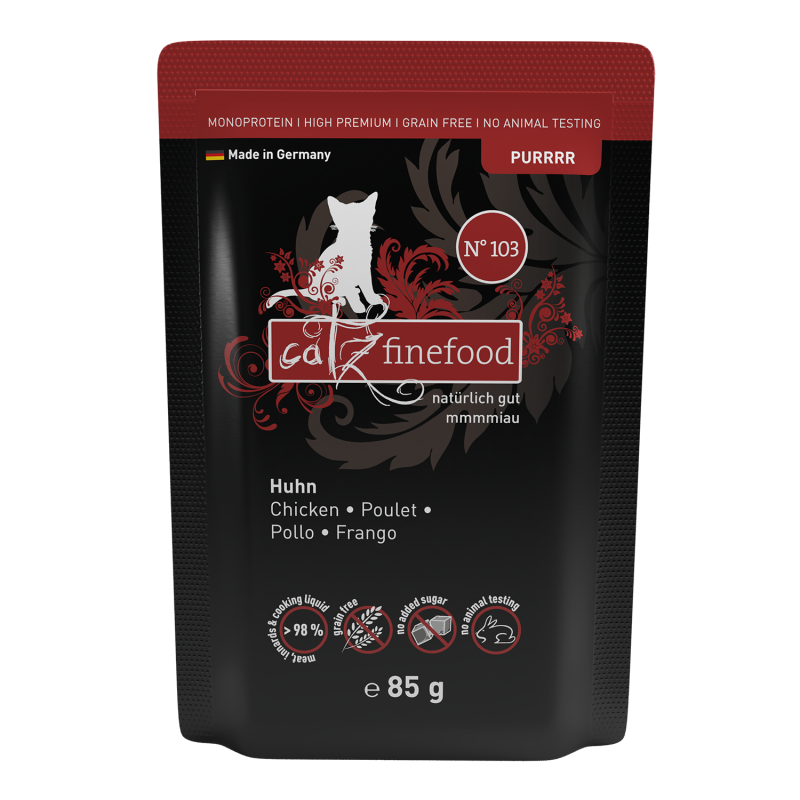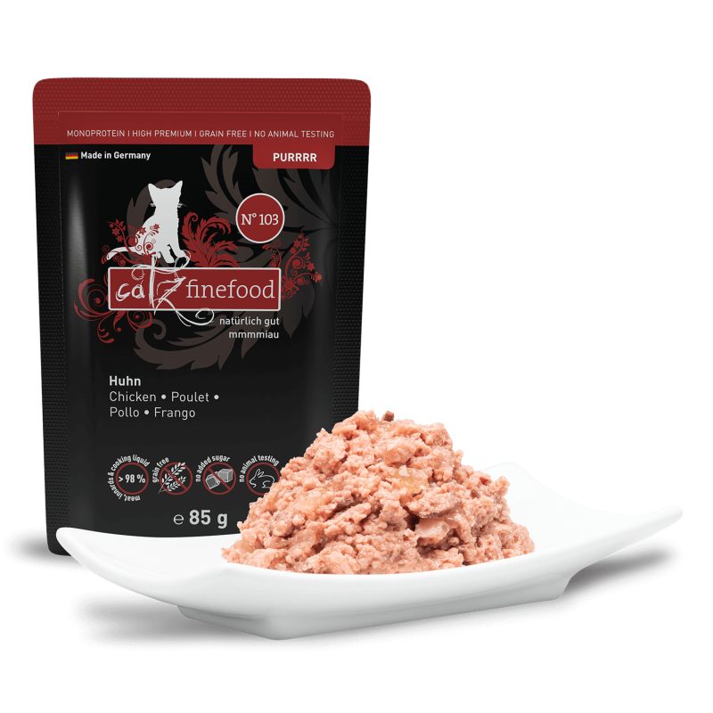 Das catzfinefood Nassfutter mit purem Huhn ist ein Festschmaus für alle Samtpfoten.