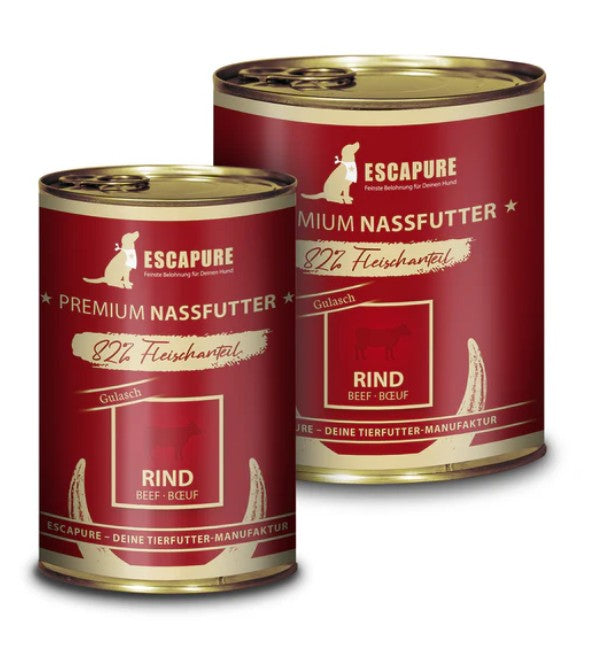 Escapure Rinder Gulasch verwöhnt Deinen Vierbeiner mit saftigem Rindfleisch und knackigem Gemüse wie Kartoffeln und Karotten.