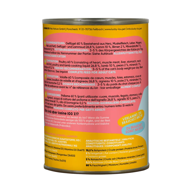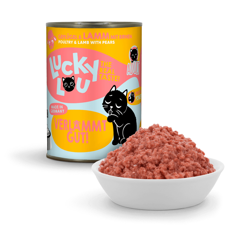 Entdecke Lucky Lou® Lifestage Adult Geflügel & Lamm – das Nassfutter, das Katzenherzen höherschlagen lässt!