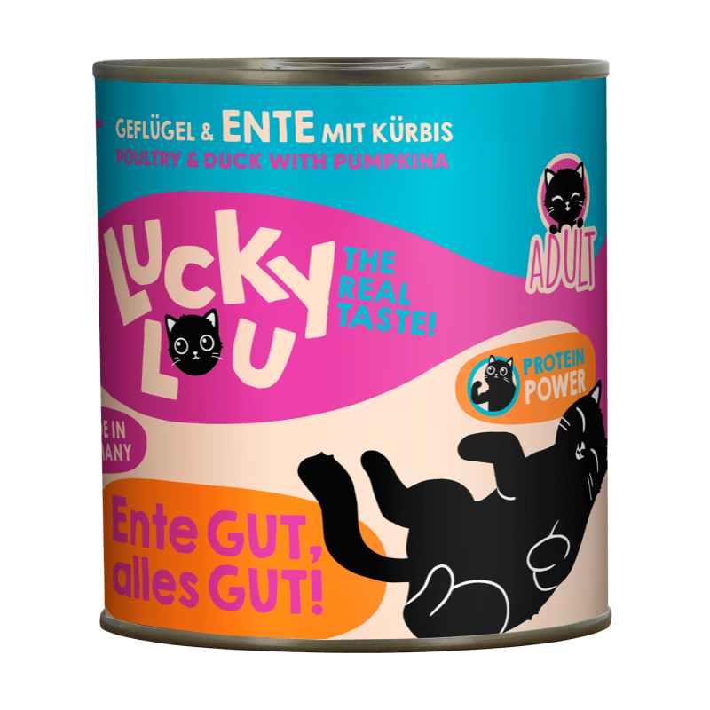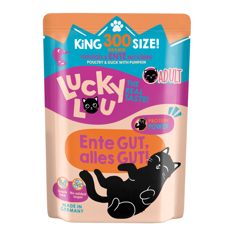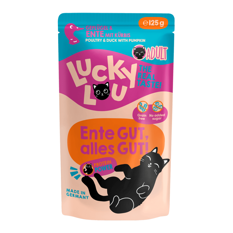 Verwöhnen Deine Katze mit Lucky Lou Adult Geflügel & Ente Nassfutter für die ausgewachsene Lifestage.