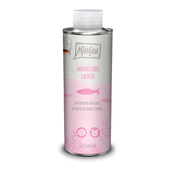 Verwöhne deine Katze mit MjAMjAM natürliches Lachsöl – dem kleinen Superhelden für glänzendes Fell und gesunde Haut!