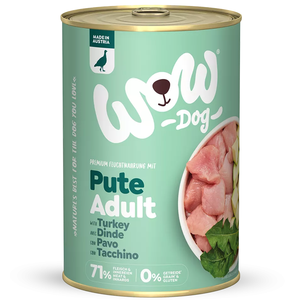 WoWDog Pute Löwenzahn und Zucchini ist ein vollwertiges Alleinfutter für ausgewachsene Hunde aller Größen und Rassen. Mit beeindruckenden 71 % Fleischanteil – bestehend aus Pute, Huhn und Rind – bietet dieses Menü pure Geschmacksfreude. Frisches Gemüse, hochwertige Kräuter und essenzielle Mineralstoffe sorgen für optimale Ernährung. Das ausgewogene Calcium-Phosphor-Verhältnis von 1,4:1 unterstützt Knochengesundheit. Ganz ohne künstliche Konservierungsstoffe und Geschmacksverstärker – nur ehrliche Zutaten mit offener Deklaration. Warnung: Der Sabberfaktor ist bei diesem Fleischgeschmack garantiert!